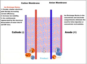Pertukaran ion dalam sistem EDI digenerasi secara terus menerus sehingga tidak seperti demineralisasi dengan sistem resin. Biasanya resistivitas air produk > 15 MΩ.cm dicapai secara konsisten dengan menggunakan proses ini. Selain keuntungan dalam hal operasional praktis dan penghematan down time proses regenerasi, EDI juga dapat memberikan tingkat kemurnian produk yang lebih konsisten dari pada sistem pertukaran ion jenis resin.